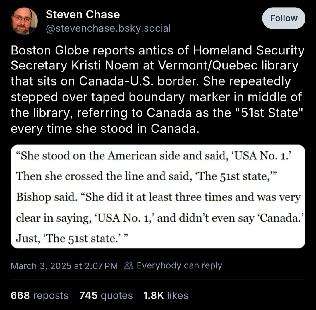 Bingo. Trump has latched onto territorial expansion, like all good dictators do, as the finis principalis (end goal) for his presidency. The threats towards Greenland, the insults hurled at Canada, and now the launching of a destructive trade war that will further impoverish Americans and greatly harm the economies of Canada and Mexico. The end result will likely be that Mexico turns more towards cooperation with South America, and maybe even China, while Canada will likely turn inward and cozy back up to the British Commonwealth more. America will suffer, and with those conditions, Trump will then blame outsiders for creating the misery that he himself is inflicting. This further allows the autocrat to consolidate their power.