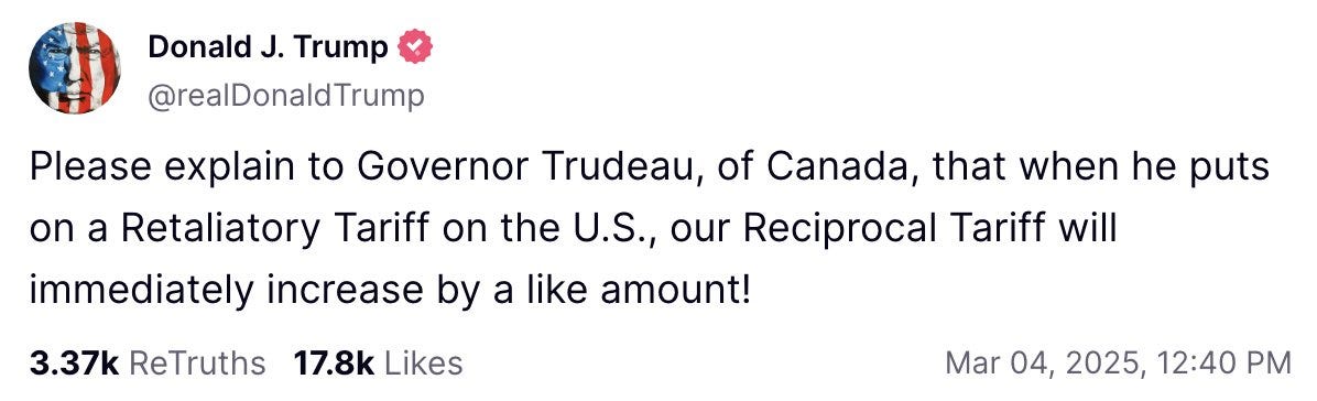 Trump has repeatedly insulted Canadian Prime Minister Justin Trudeau as the “governor of the great state of Canada” in tweets over the last three months, and when Trudeau announced immediate reciprocity on tariffs today, Trump tweeted this.