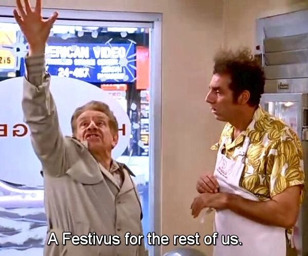 Seinfeld’s fake holiday of Festivus, which Jerry Stiller so memorably explained to the world in December 1997, has become an icon in pop-culture. Everything from the slogan to the ritual airing of grievances allows us to have a few laughs during the stress of the holiday season. I’ve included the video below so you can learn about the magic of Festivus, and then I shall begin the airing of my grievances.