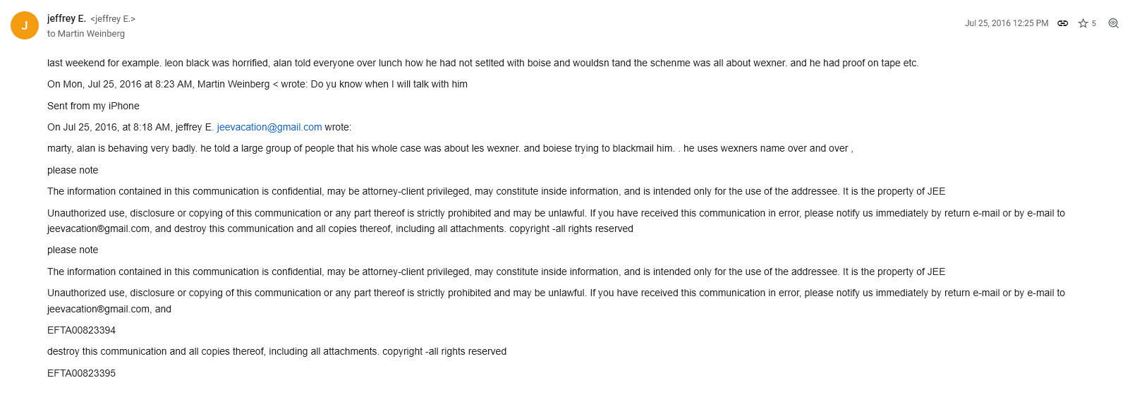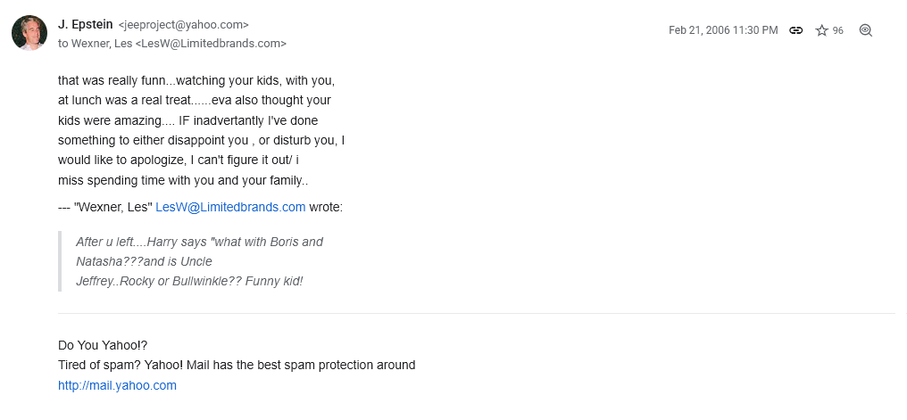 Epstein’s tone indicates that he is protecting Wexner in some capacity here. It could be he doesn’t want to draw Wexner’s ire (if Wexner’s account is true of their split), or that Dershowitz risks exposing Epstein’s current activities by drawing attention to Wexner (and therefore, himself), or that they still had a genuine friendship and good feeling about each other. It’s hard to know without the context of missing emails and files, but there’s one thing that is for certain.
