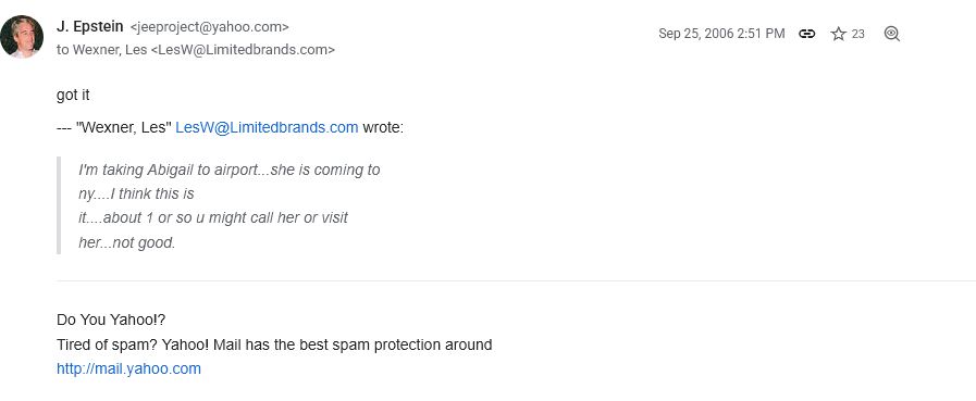 Furthermore, he testified that he cut ties with Epstein at this point in 2007, and a year thereafter Epstein went to prison. Except…Les Wexner and Epstein had this email exchange in 2008, which doesn’t fit his tale.
