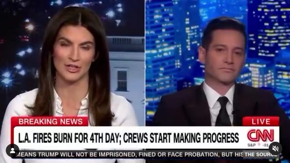 It should also be noted, of course, that the anchors hosting these segments bear responsibility for not challenging Flagg’s expertise to make such glib assessments. I don’t have much hope for Fox News, but Kaitlyn Collins at CNN surely could have interrupted after the second time Flagg name-dropped Rick Caruso to ask him for some evidence to back his opinion, or some experties about how it could’ve been handled better. Just as she did when faced with Donald Trump’s bulldozer tactics at the town hall she questioned him at, Collins froze in the face of Flagg’s breezy self-assuredness. I won’t go into my long-held belief that she’s not cut out for anchoring, but the question is low-hanging fruit and Collins still couldn’t find a way to ask it.