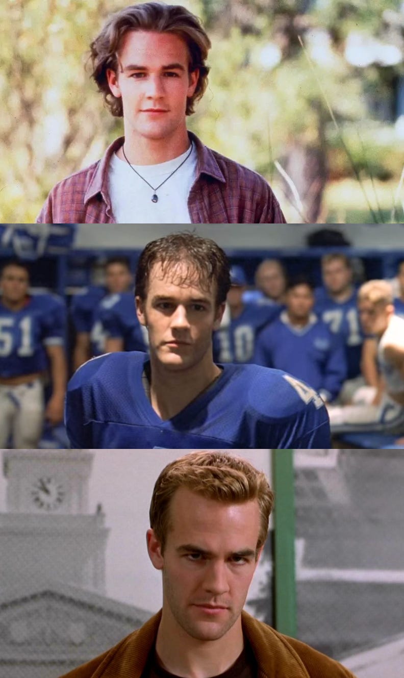 I was sixteen years old when Dawson’s Creek sprang onto our televisions, and James Van Der Beek, with all of that glorious hair and a fashion sense I slowly adopted over the subsequent year, became a household name as the budding film director Dawson Leery, navigating the high school years and a best friendship with Katie Holmes’ Joey Potter that veered into attraction, love, and complicated relationships. But, outside of Dawson’s wardrobe, I didn’t pay much attention to the show, or Van Der Beek, for that matter. That changed a year later, when Varsity Blues, his first star turn in a film (and I’m pretty positive the first theatre film release from MTV Studios), and a story that I related to pretty hard. I was in the midst of a very challenging senior year of high school, having missed my second consecutive homecoming game due to injury, and our team collapsing under the weight of too many injuries and too few players.