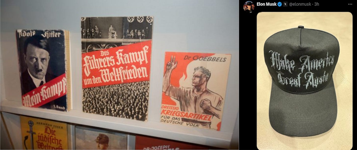 Elon Musk debuted his new “Dark MAGA” hat that just happens to use a Fraktur-based font, which is heavily associated with German nationalism and the Nazis in Germany. Its use is often seen in Germany as being sympathetic to Nazi ideals.
