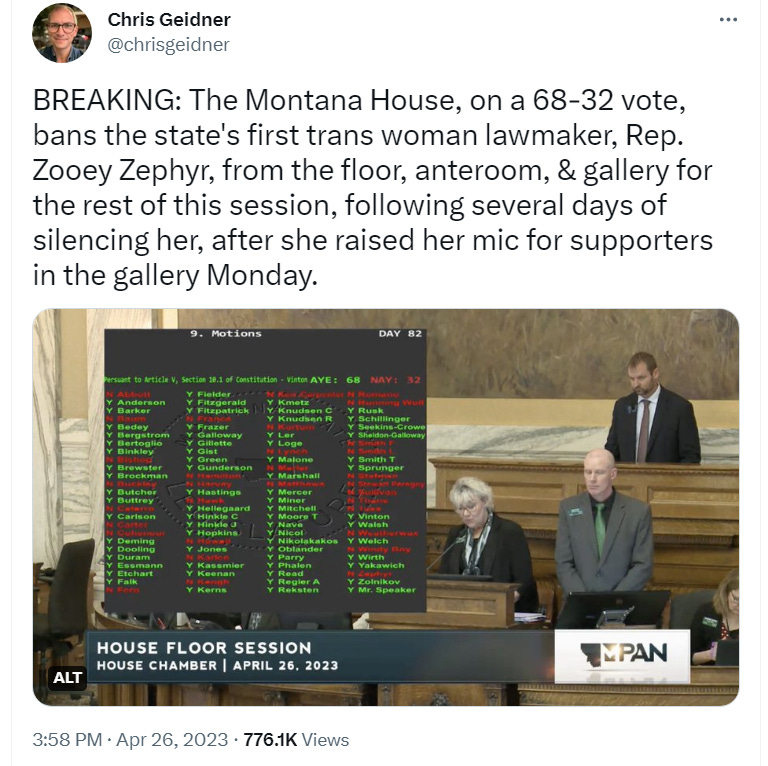 Edited 4/26/2023 at 5:32 pm for update. Montana’s legislature has barred Zephyr from the House for the remainder of the session, with one GOP lawmaker saying, “Well, we didn’t expel her.”