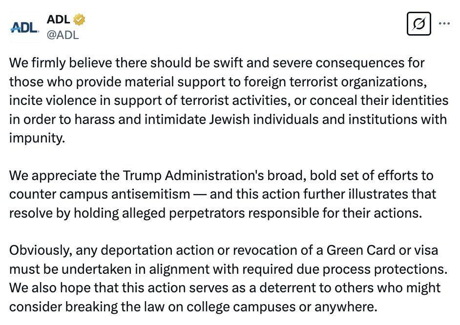 And, in a truly grotesque display, the Anti-Defamation League (who have slid so far away from battling actual anti-Semitism that they barely condemned the blatant antisemite hired at the Pentagon as deputy press secretary) posted this statement.