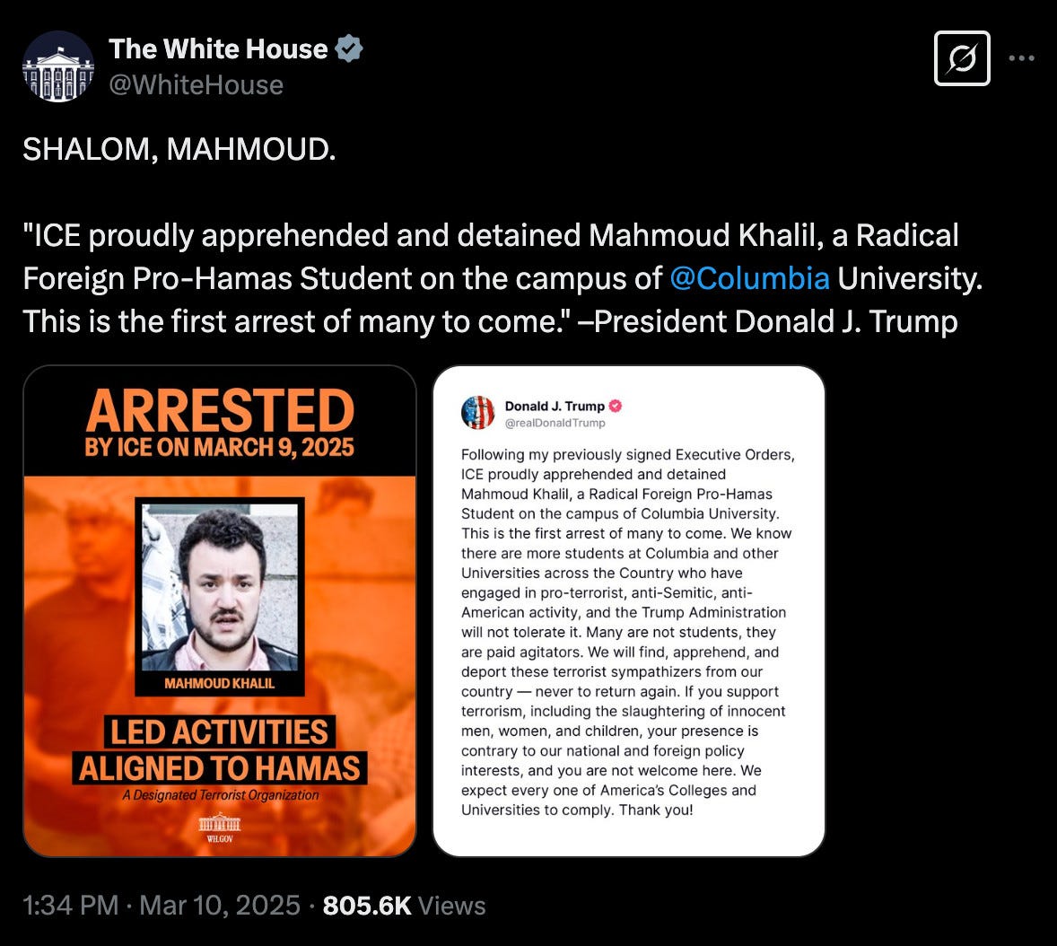 We’ll come back to this in a second, though, because those cases have been dwarfed by this weekend’s actions. Mahmoud Khalil, a permanent legal resident (green card holder) who is married to an American citizen, was arrested by ICE on the campus of Columbia University Saturday on false charges (that his visa was revoked when he didn’t have a visa because he had a green card and that by organizing protests against the Israeli destruction of Gaza, he was aiding Hamas). His wife, who is eight months pregnant, was threatened with arrest because she knew their rights and knew this was a false arrest. She called their attorney, who demanded a warrant be produced. The ICE agents, as all such secret police thugs do, hung up on the attorney instead and took Khalil away.